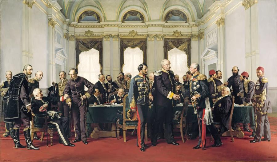 zdjęcie: obraz Antona von Werner, Der Berliner Kongreß 1878 (1881) – przedstawia scenę z kongresu berlińskiego, podczas którego kanclerz Bismarck, który zaoferował swoje usługi jako odpowiedzialny makler (verantwortlicher Makler), odniósł swój największy sukces dyplomatyczny